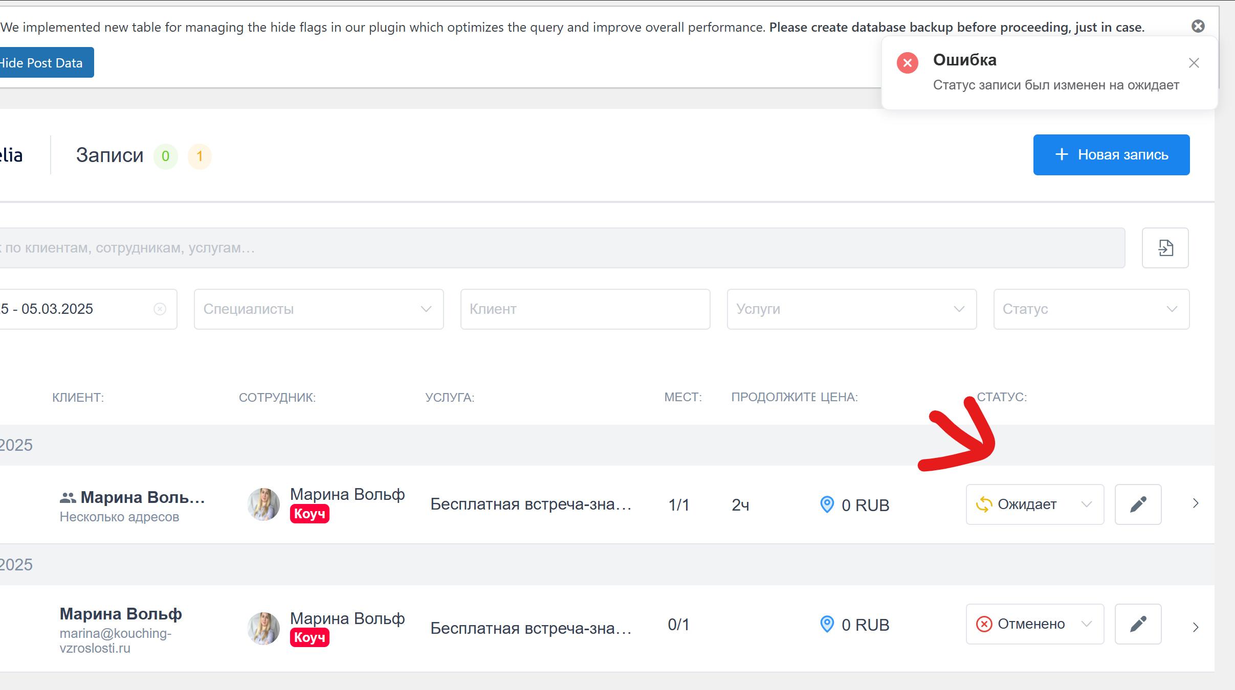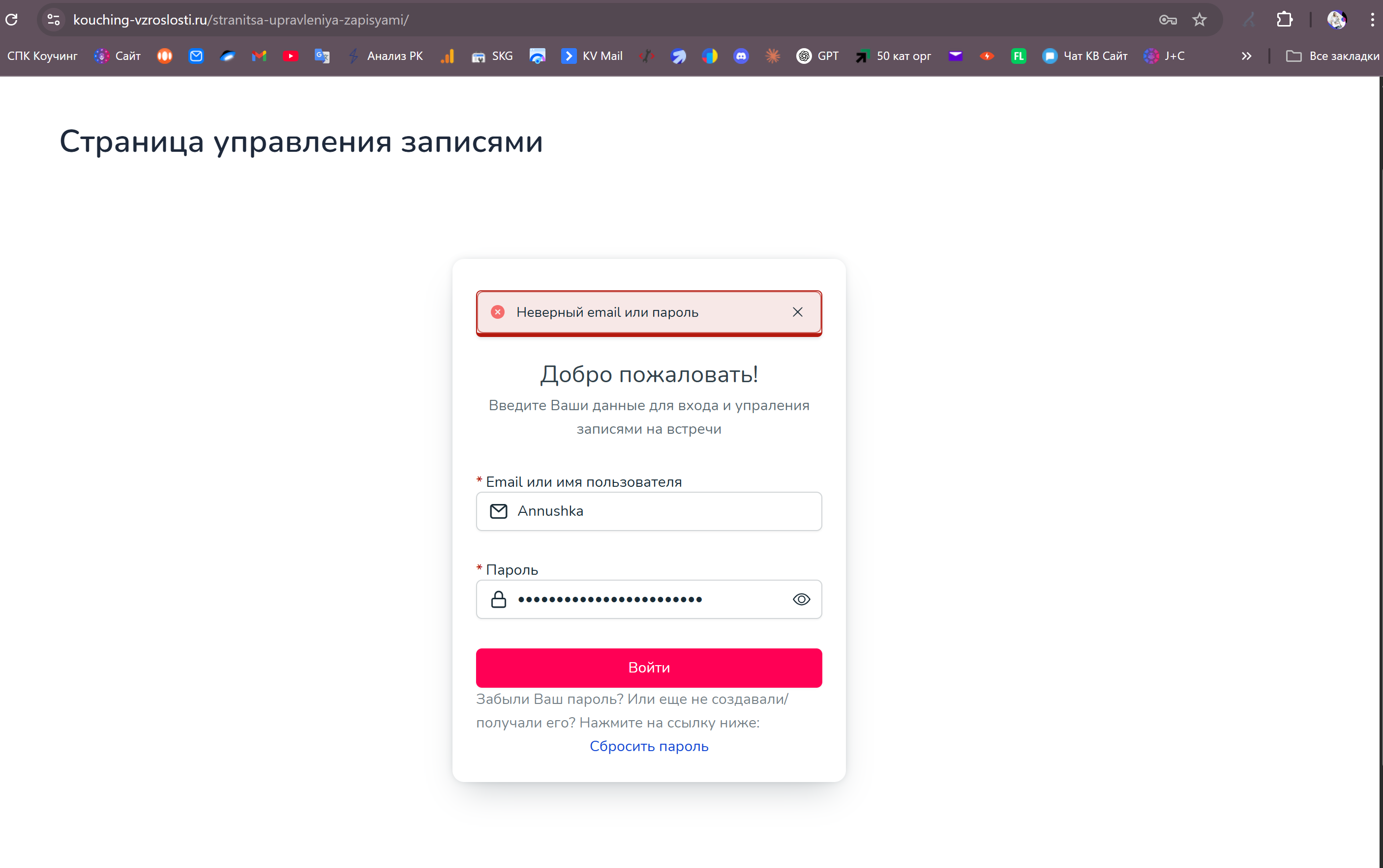 Regarding logging into the client's account, the problem is that when trying to make a new password, after the step of entering a new password, the form does not change, it is impossible to log into the personal account, since only the password change form appears, no further steps occur and I cannot fix this with any of my actions, this is the plugin script. In theory, if I understand everything correctly, after a person has entered a new password, a form should appear for entering a login and password. But in the functionality at the moment, the password change form is frozen, and even resetting the cache or all browser settings does not change this form. https://kouching-vzroslosti.ru/stranitsa-upravleniya-zapisyami/ attachmetn video about thas problem.
